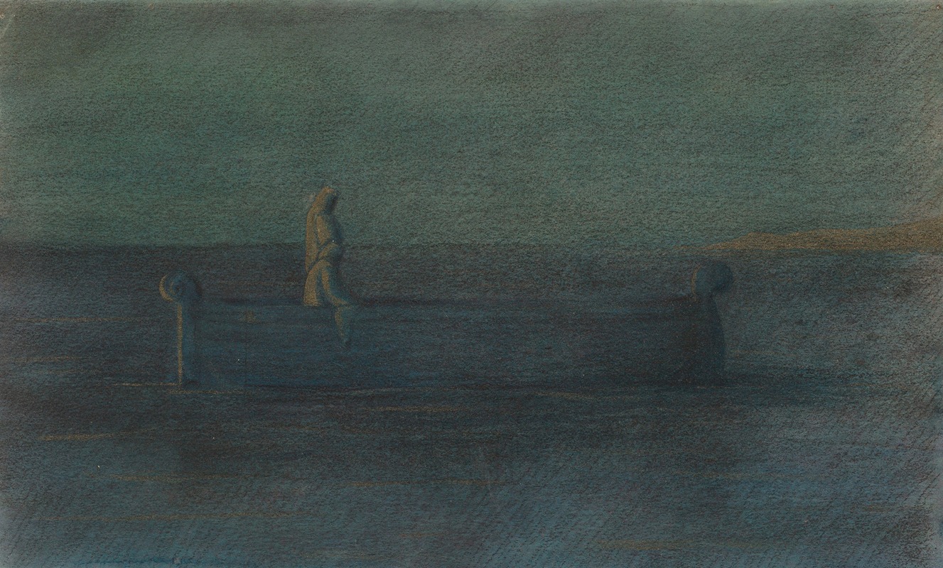 Herbert Crowley was a British artist known for his distinctive contributions to early 20th-century art, particularly in the realms of illustration and painting. One of his notable works is "Two Cloaked Figures in a Boat," a painting that exemplifies his unique style and thematic interests. Crowley, who was born in 1873 in London, initially pursued a career in theater design before transitioning to visual arts. His work often explored themes of mysticism, fantasy, and the subconscious, which were prevalent in the art movements of his time, such as Symbolism and Surrealism.