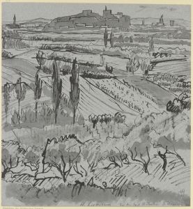 Schäferszene; Paar mit nacktem Oberkörper unter Bäumen sitzend, neben ihnen ein Hund