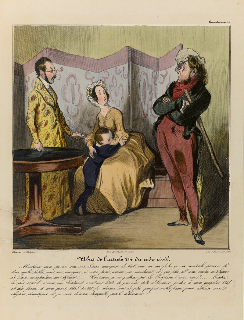 Honoré Daumier, a prominent French artist known for his caricatures, paintings, and sculptures, created the artwork "Abus de l’article 214 du Code civil" in the 19th century. Daumier was renowned for his keen observation of social and political issues, often using satire to critique the society of his time. This particular work, whose title translates to "Abuse of Article 214 of the Civil Code," reflects Daumier's engagement with the legal and social norms of 19th-century France.