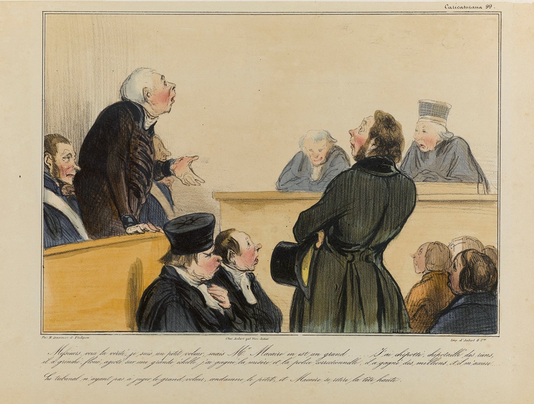 Daumier's lithographs, including this one, were created using the lithographic printing technique, which allowed for mass production and wide dissemination of his satirical messages. His works often targeted the injustices of the legal system, the corruption of politicians, and the moral failings of the upper classes. This particular piece reflects Daumier's sharp critique of the legal and social systems of his time, which he saw as favoring the wealthy and powerful while punishing the poor and marginalized.