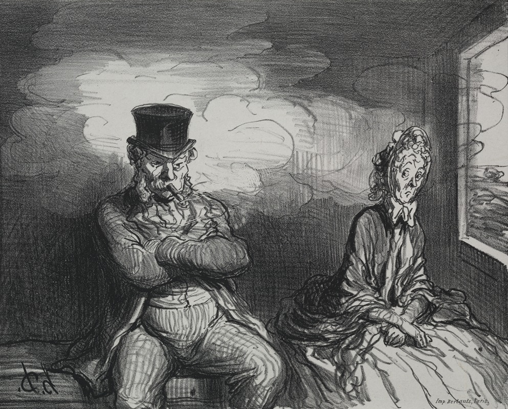 Honoré Daumier, a prominent French artist known for his caricatures, paintings, and sculptures, created the artwork "On the Train; A Pleasant Companion" during the 19th century. Daumier's work often reflected the social and political climate of his time, and he is particularly noted for his keen observations of the human condition and his ability to capture the essence of everyday life.