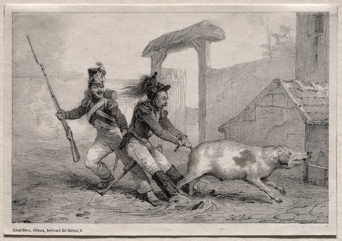 The composition of the painting is dynamic, with a strong sense of movement and tension. Vernet's use of color and light enhances the drama of the scene, drawing the viewer's eye to the central figures engaged in the act of marauding. The attention to detail in the depiction of uniforms, weaponry, and expressions adds to the authenticity of the scene, a hallmark of Vernet's style.