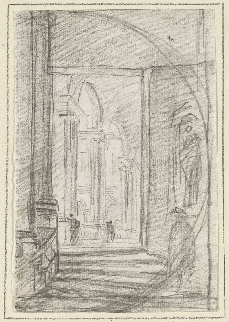 Hubert Robert, often referred to as "Robert des Ruines" due to his specialization in ruin paintings, was deeply influenced by his time in Italy. He lived in Rome from 1754 to 1765, where he studied classical ruins and the works of Italian masters. This period profoundly shaped his artistic style, which often combined real architectural elements with imagined or exaggerated compositions. "Interior of a Roman Palace" reflects this approach, showcasing Robert's skill in rendering grandiose spaces and his interest in the interplay of light and shadow.