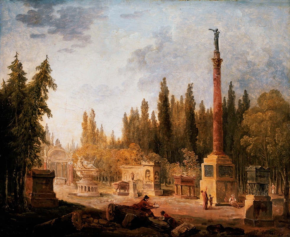 Hubert Robert's painting captures the tranquil and contemplative atmosphere of the garden. His composition often includes a blend of natural elements and architectural features, creating a harmonious balance between nature and human-made structures. In this work, Robert's use of light and shadow enhances the textures of the stone monuments and the lush greenery, inviting viewers to reflect on the passage of time and the enduring beauty of historical relics.