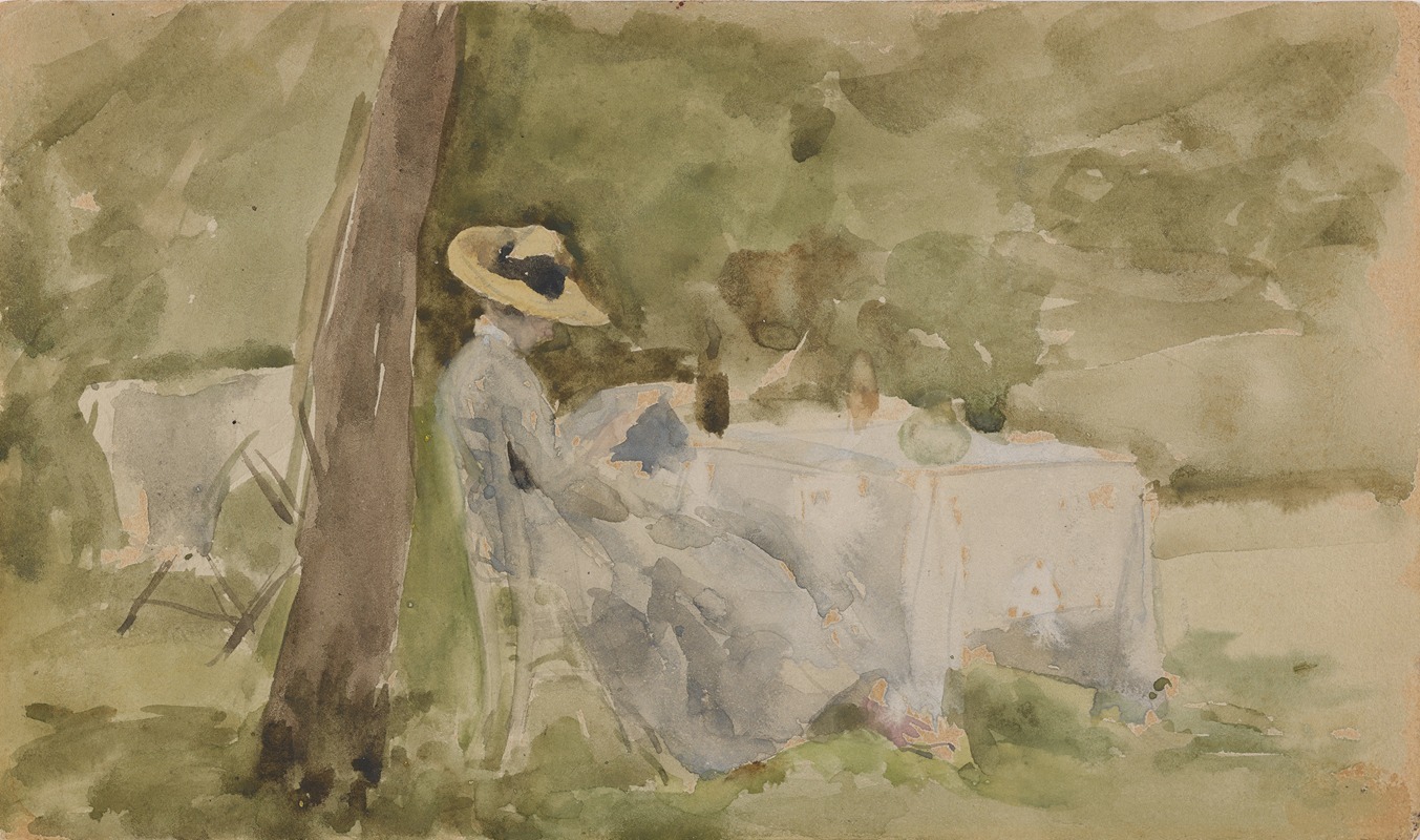 "Breakfast in the Garden" was created in 1883, a period when Whistler was deeply engaged in exploring the effects of light and atmosphere in his paintings. The painting depicts a serene outdoor scene, capturing a moment of leisure and tranquility. The composition features a woman seated at a table in a garden, enjoying a meal. The setting is lush and verdant, with an emphasis on the interplay of light and shadow among the foliage.