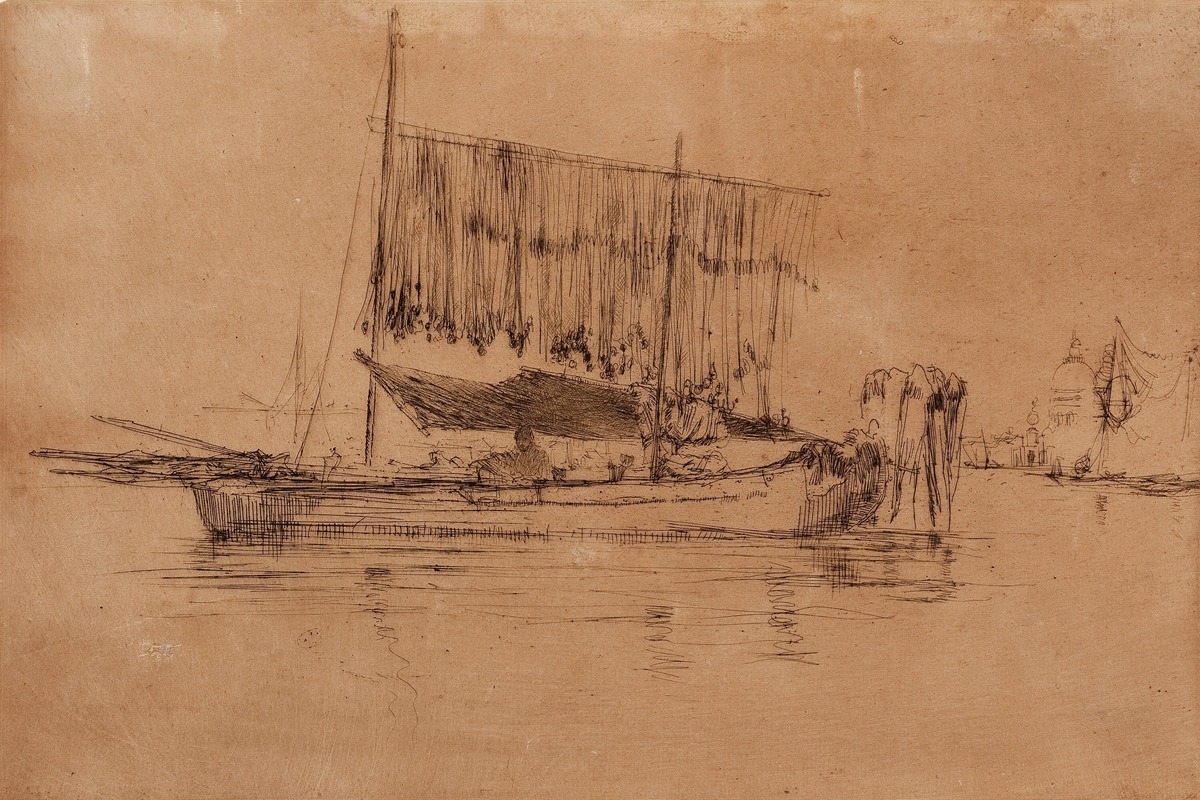 "Fishing Boat" likely belongs to a series of works where Whistler explored the interplay of light and water, capturing the serene and sometimes melancholic essence of the sea. His maritime paintings often feature boats, harbors, and coastal scenes, rendered with a delicate touch and an eye for detail. Whistler's ability to convey the reflective qualities of water and the nuances of the sky is a testament to his skill as a painter.