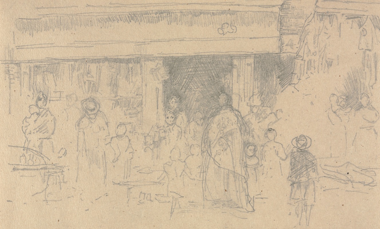 "Shops at Chester" is one of Whistler's etchings, a medium in which he excelled and gained considerable recognition. Etching is a printmaking technique that involves using acid to cut into the unprotected parts of a metal surface to create a design in the metal. Whistler's etchings often depicted urban scenes and architectural subjects, capturing the essence of the locations with a keen eye for detail and atmosphere.