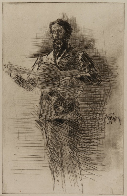 The subject of "The Guitar Player" is depicted in a contemplative pose, holding a guitar, which suggests a moment of introspection or musical engagement. Whistler's attention to detail and his delicate brushwork highlight the textures of the clothing and the instrument, while the background is rendered in soft, muted tones that draw attention to the figure. This approach is consistent with Whistler's interest in creating a sense of intimacy and immediacy in his portraits.