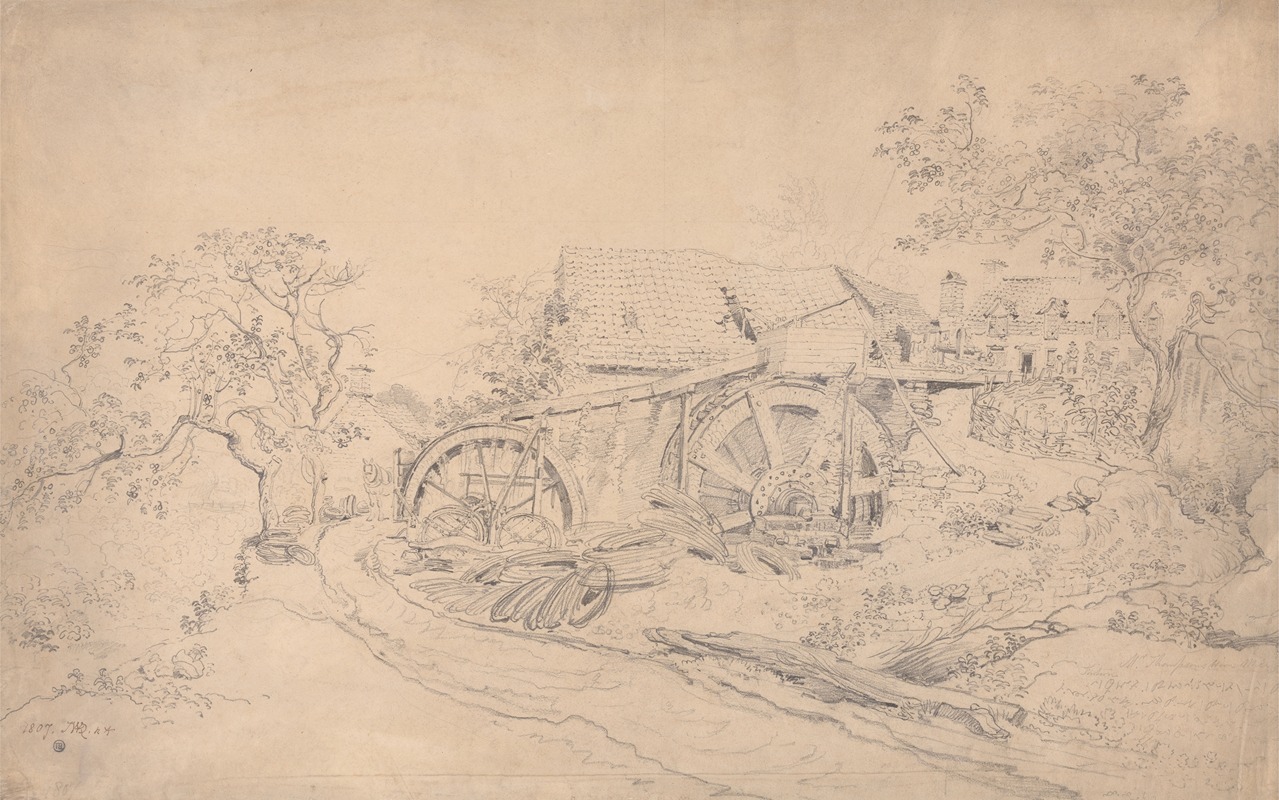 "Mr. Thompson’s Wire Mill, Tintern" is a painting by the British artist James Ward, created in 1804. James Ward (1769–1859) was a notable painter and engraver, recognized for his animal paintings and landscapes. This particular work is an oil painting that depicts the wire mill owned by John Thompson in Tintern, Monmouthshire, Wales.