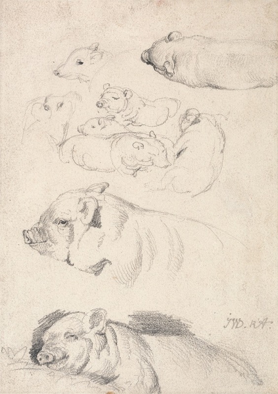 "Studies of Pigs" is a painting by the British artist James Ward (1769–1859), a prominent figure in the Romantic movement and one of the leading animal painters of his time. Created in the early 19th century, the artwork exemplifies Ward's meticulous attention to detail and his ability to capture the essence of animals in their natural state. The painting depicts a group of pigs in a rural setting, rendered with remarkable realism and sensitivity. Ward's skillful use of light and texture highlights the physical characteristics of the animals, such as their coarse hair, plump bodies, and expressive features.
