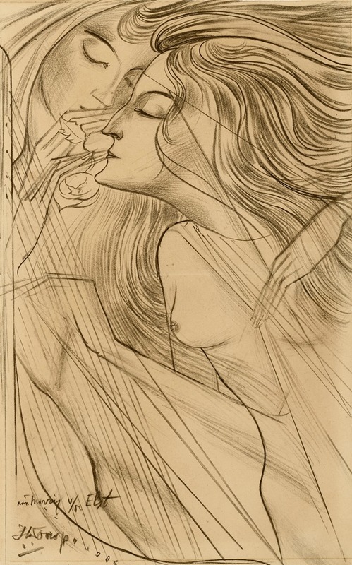 The painting "Twee muzen" is a notable example of Toorop's Symbolist phase, characterized by its mystical and allegorical themes. The artwork depicts two female figures, often interpreted as muses, which are mythological figures representing the arts and inspiration. The figures are rendered with intricate, flowing lines and a sense of ethereal beauty, which is typical of Toorop's work during this period.