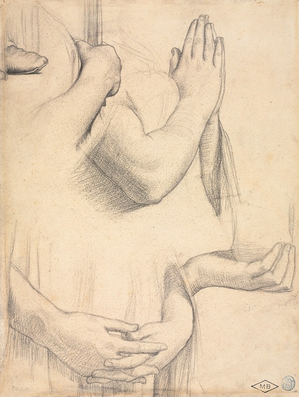 Jean Auguste Dominique Ingres, a prominent French Neoclassical painter, is renowned for his precise draftsmanship and his ability to convey texture and form through his art. Among his many works, "Study of Hands" is a notable piece that exemplifies his skill in capturing the human form with meticulous attention to detail. Although specific details about this particular study are limited, it is reflective of Ingres' broader artistic practice and his dedication to the study of anatomy and form.