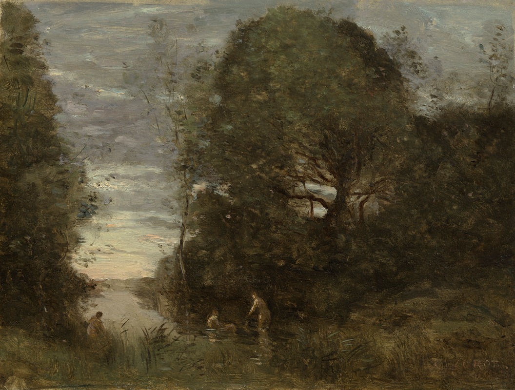 In summary, "Baigneuses dans une crique boisée" by Jean-Baptiste-Camille Corot is a quintessential example of the artist's mature style, showcasing his talent for integrating human figures within natural landscapes and his influence on subsequent generations of artists. The painting's serene atmosphere and masterful use of light and composition make it a noteworthy work in the history of French landscape painting.