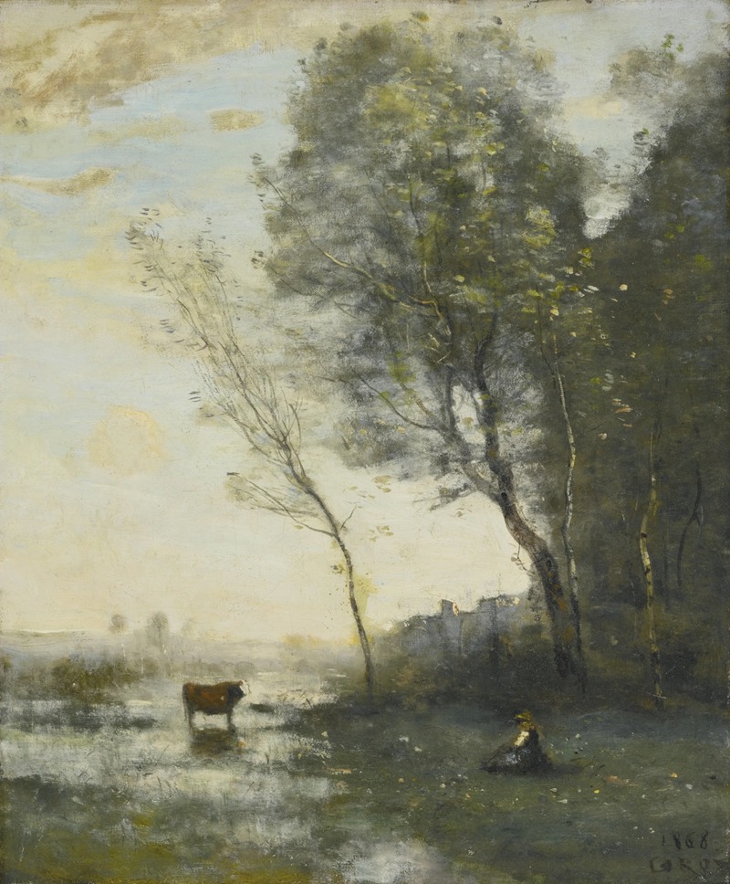 "Paysanne gardant une vache au bord de l’eau" is a testament to Corot's enduring legacy as a landscape painter. His ability to evoke a sense of peace and connection with nature continues to resonate with viewers, making his work a significant contribution to the history of art. The painting remains an example of Corot's dedication to portraying the natural world with sensitivity and insight, qualities that have secured his place as a master of landscape painting.