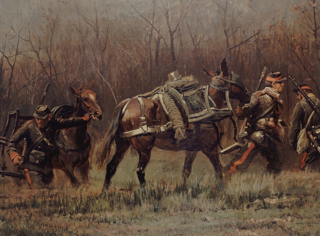In the painting, Detaille captures the harsh realities of war, showing the soldiers in a moment of respite as they lead the mules through a rugged landscape. The attention to detail is remarkable, from the uniforms and equipment of the soldiers to the expressions on their faces, which convey a sense of determination and fatigue. The mules, laden with medical supplies, are a reminder of the constant need for medical care and the efforts to save lives amidst the chaos of battle.