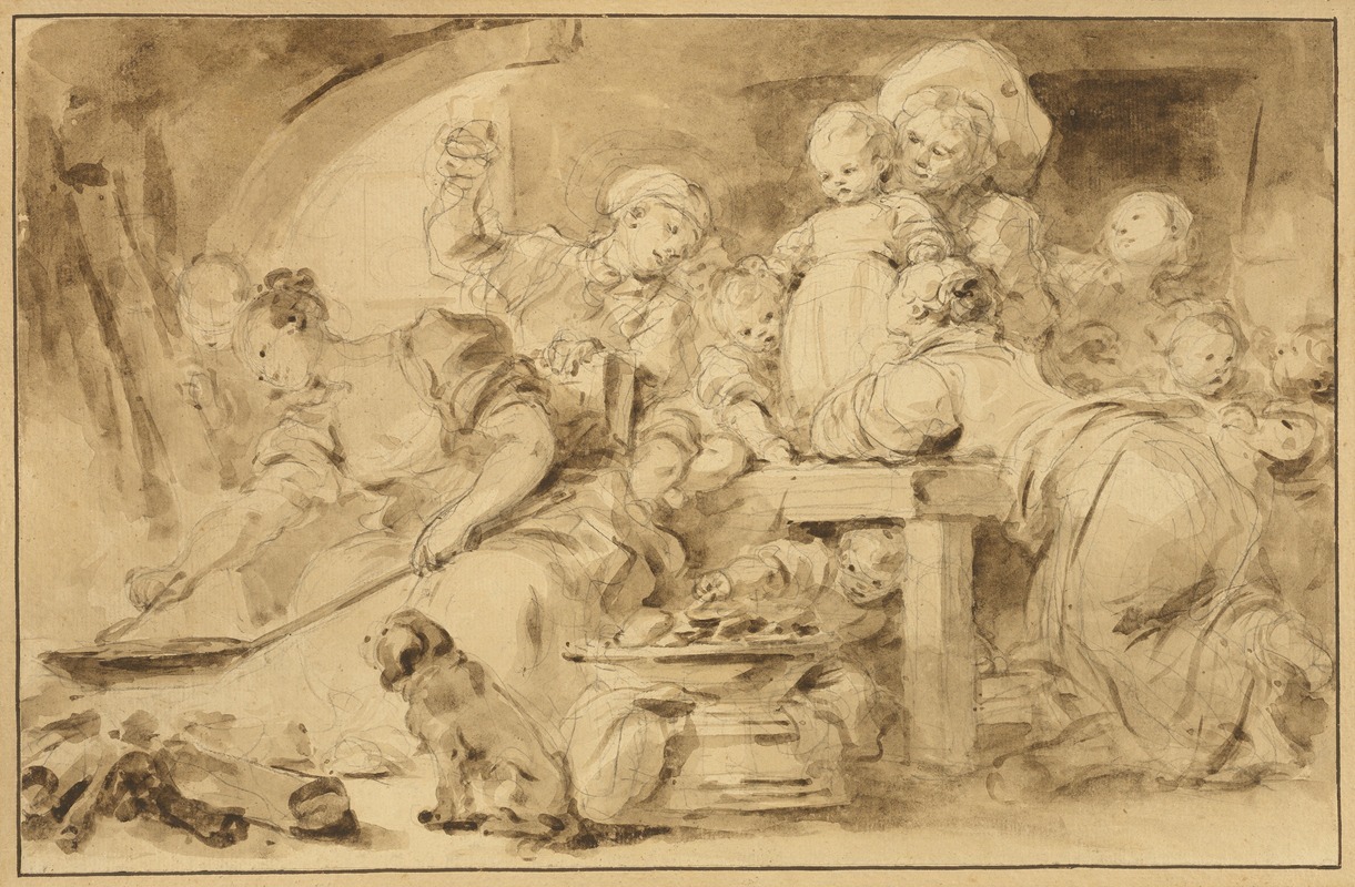 "Making Fritters" is a genre painting, a category that focuses on scenes of everyday life. Fragonard, known for his ability to infuse such scenes with a sense of lightness and vivacity, brings this talent to the fore in this particular work. The painting depicts a domestic scene where figures are engaged in the activity of making fritters, a type of fried pastry. This subject matter is indicative of Fragonard's interest in the quotidian aspects of life, presenting them with a sense of warmth and approachability.