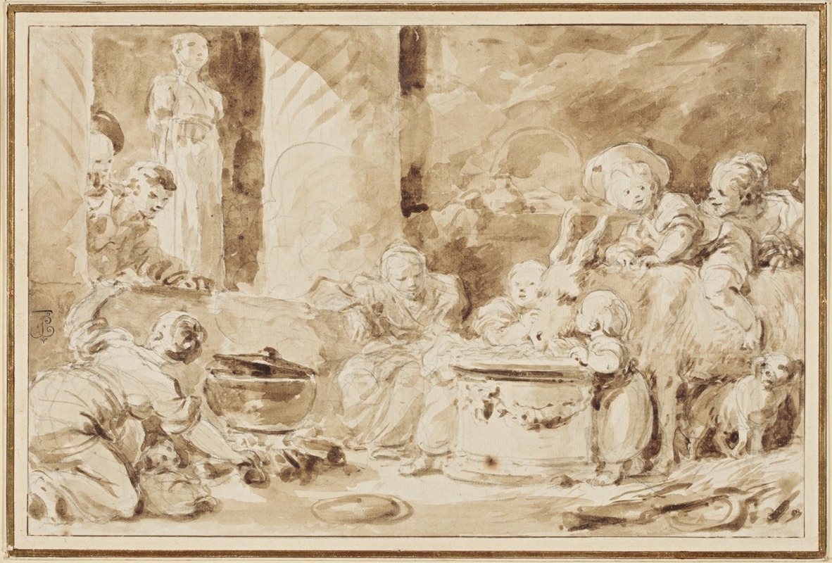While the specific painting "Vor einer antiken Statue lassen Kinder einen Esel von einem Altar fressen" does not appear in major catalogues or collections, Fragonard's body of work often included mythological and allegorical themes, sometimes incorporating animals and children in a manner that added a layer of narrative or symbolic meaning. His paintings frequently explored themes of innocence and experience, often juxtaposing youthful playfulness with more mature or classical elements.