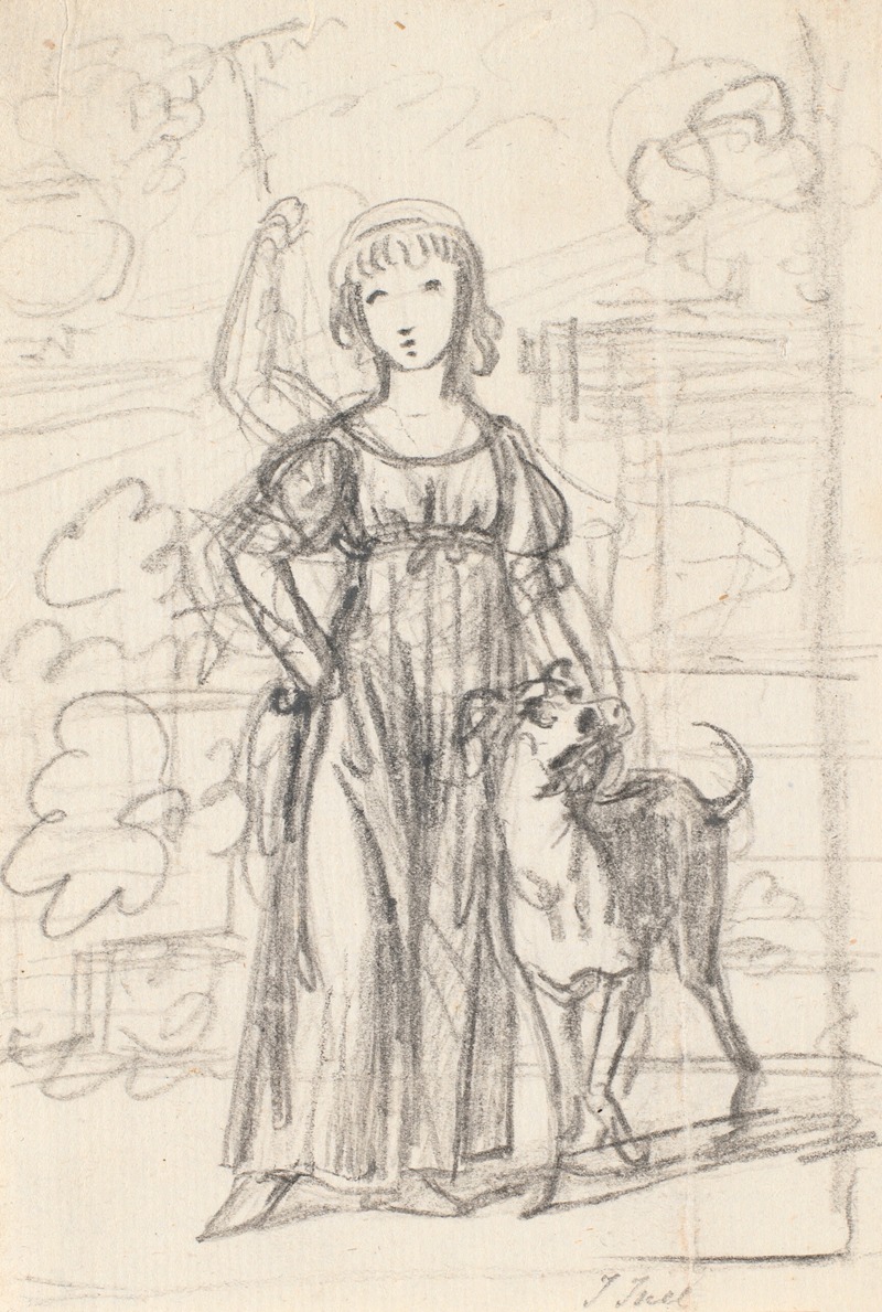 Kompositionsudkast til et portræt af en ung pige med højre hånd i siden og venstre arm om halsen på sin hund, stående ved en havetrappe