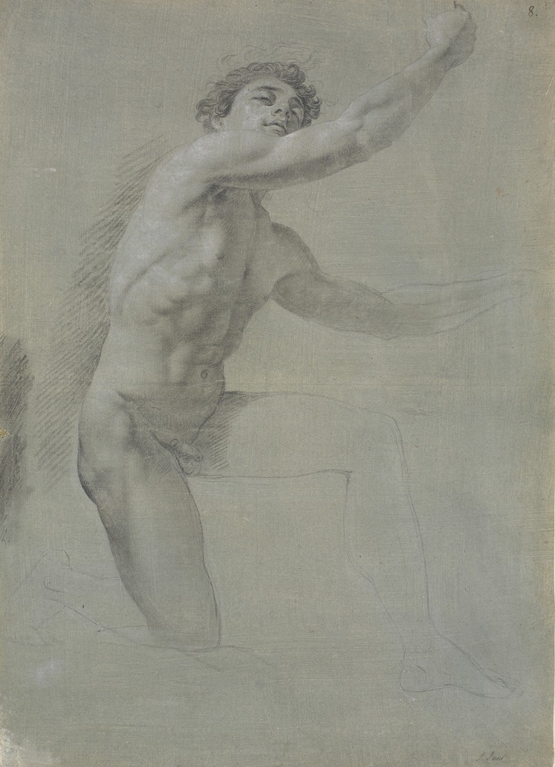 The drawing "Model set forfra, knælende på højre ben; ikke tegnet færdig" is a testament to Juel's skill in capturing the human form. Although unfinished, the piece reveals his meticulous approach to composition and anatomy. The model is depicted kneeling on the right knee, a pose that suggests a sense of grace and poise. The unfinished nature of the drawing allows viewers to see the underlying structure and preliminary lines that Juel used to construct his figures, offering a rare glimpse into the artist's technique.