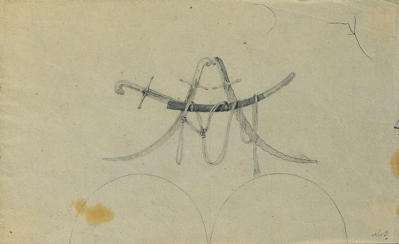 "Studie mit Säbeln" (Study with Sabres) is one of Krafft's works, although specific details about this particular painting are scarce. The title suggests that the painting involves a study or depiction of sabres, which are curved, single-edged swords historically used in cavalry. Such studies were common among artists of the time, who often created detailed sketches or paintings of weapons, armor, and other military paraphernalia as part of their exploration of historical and military themes.