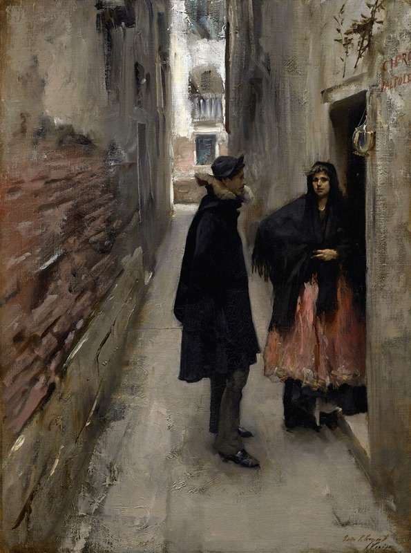 The painting is an example of Sargent's ability to capture the essence of a place with economy and precision. His work in Venice marked a departure from the formal portraiture for which he was primarily known, allowing him to explore more spontaneous and intimate scenes. This shift is evident in the relaxed and informal composition of "A Street in Venice," which contrasts with the more structured and posed nature of his portraits.