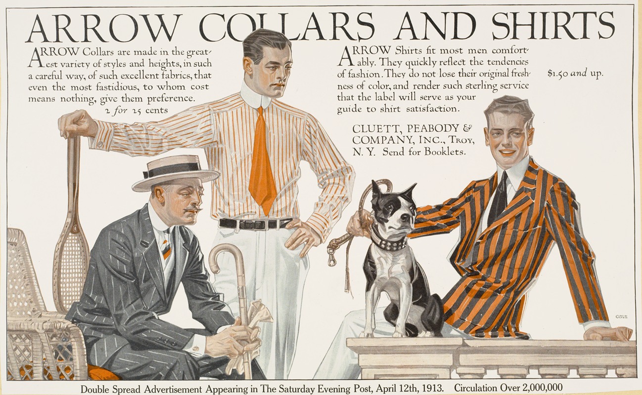 Joseph Christian Leyendecker, an influential American illustrator of the early 20th century, created numerous iconic works, including advertisements for Arrow collars and shirts. Leyendecker's illustrations for Arrow became some of the most recognizable and celebrated commercial art of the period, helping to define the visual culture of the time. His work for the brand was featured prominently in publications such as The Saturday Evening Post, a widely circulated magazine that showcased his artistry to a broad audience.