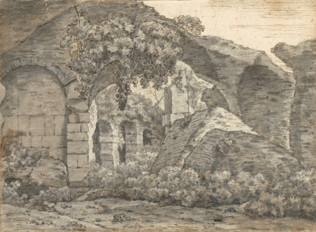 In summary, "Roman Ruins" by Joseph Wright of Derby is a painting that captures the beauty and transience of ancient Roman architecture. Through his skillful use of light and shadow, Wright creates a dramatic and atmospheric depiction of the ruins, reflecting his broader artistic concerns and his interest in the classical world. The painting is a testament to Wright's ability to convey both the grandeur and the impermanence of human achievements, making it a significant, though perhaps lesser-known, work in his oeuvre.