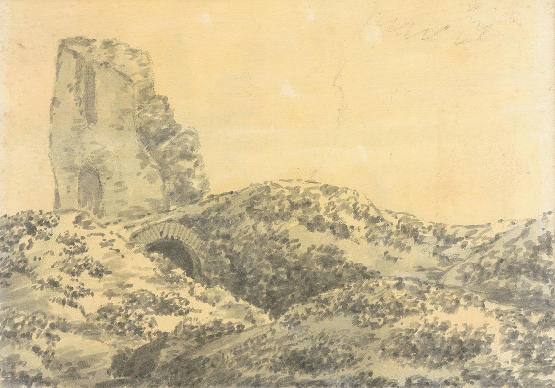 "Ruined Roman Tower in a Landscape" is a painting by Joseph Wright of Derby, an 18th-century English artist renowned for his dramatic use of light and shadow, often associated with the artistic movement of Romanticism and the Enlightenment. This work exemplifies Wright's interest in landscapes and ruins, themes that were popular during his time as they evoked a sense of history, decay, and the sublime.