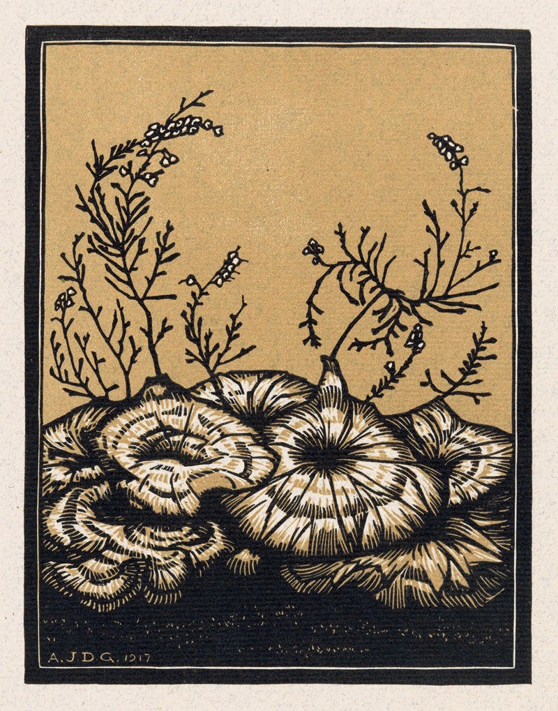 Julie de Graag (1877–1924) was a Dutch artist known for her graphic works, including woodcuts, linocuts, and drawings. Her work often depicted natural subjects, such as plants and animals, rendered in a highly stylized and detailed manner. One of her notable works is Bloeiende planten (translated as "Flowering Plants"), which exemplifies her meticulous approach to botanical illustration and her affinity for nature as a central theme in her art.