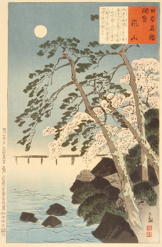 "Arashiyama, Kyoto" is a woodblock print created by Kobayashi Kiyochika, a renowned Japanese artist of the Meiji period. Kiyochika, born in 1847 and passing away in 1915, is celebrated for his innovative approach to ukiyo-e, a genre of Japanese art that flourished from the 17th through 19th centuries. His works often reflect the rapid modernization of Japan during the Meiji era, blending traditional techniques with Western influences.