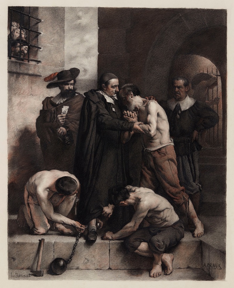 In "Saint Vincent de Paul rachète les galériens," Bonnat captures a moment from the saint's life when he was involved in the redemption of galley slaves. During the 17th century, galley slaves were individuals condemned to row in the galleys, a form of punishment that was both physically demanding and brutal. Saint Vincent de Paul was known for his efforts to improve the conditions of these prisoners and even to secure their release.
