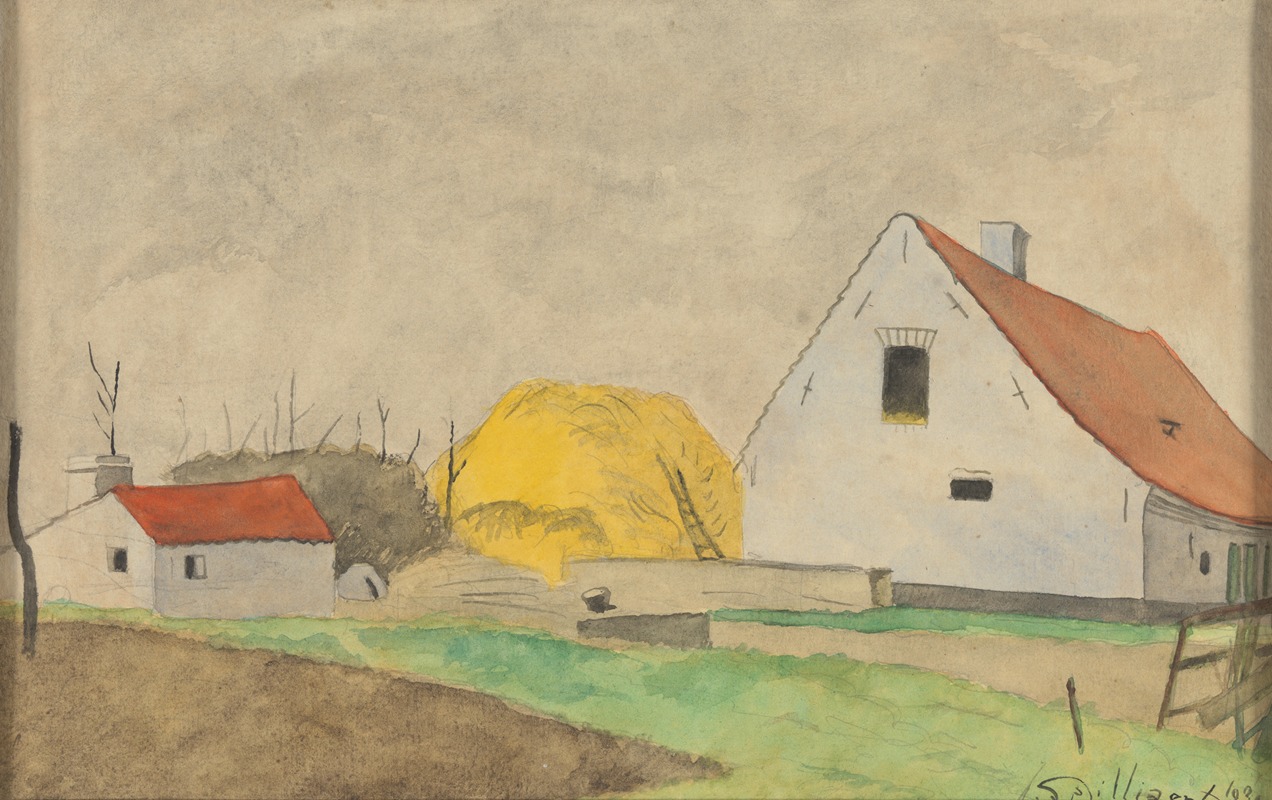 "Boerderij langsheen de Gistelse Steenweg," which translates to "Farm along the Gistelse Road," is one of Spilliaert's many works that depict the landscapes and environments of Belgium, particularly those around his hometown of Ostend. This painting captures a rural scene, likely inspired by the Flemish countryside, which Spilliaert often explored in his art. The Gistelse Steenweg is a road in Belgium, and the painting's title suggests a specific location that might have been familiar to Spilliaert, providing a tangible connection to the real world amidst his often dreamlike and atmospheric compositions.