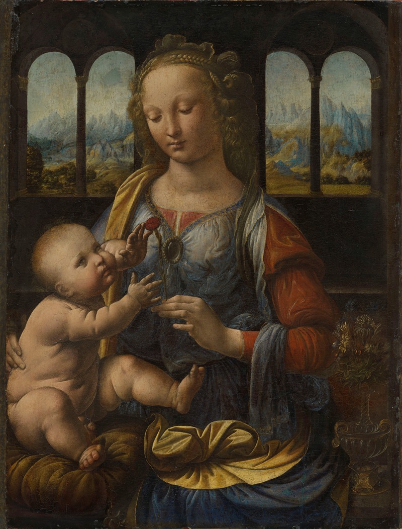 The painting depicts the Virgin Mary seated with the Christ Child on her lap. Mary is shown holding a carnation, a symbol often associated with divine love and the Passion of Christ. The background features a window that opens to a distant landscape, a common element in Renaissance paintings that adds depth and perspective to the composition. The use of light and shadow in the painting demonstrates Leonardo's early exploration of chiaroscuro, a technique he would later master and become famous for.