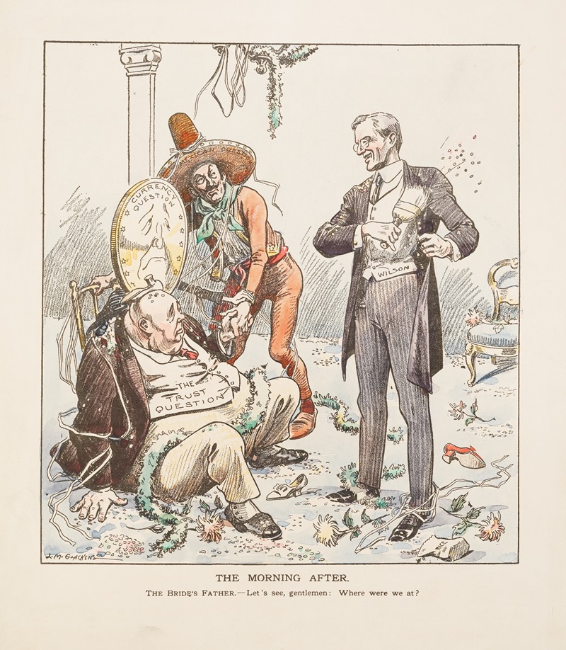 "The Morning After. The bride’s father – Let’s see, gentlemen; Where were we" is a painting by American artist Louis Glackens. Louis Glackens, born in 1866 and died in 1933, was an illustrator and painter known for his work in both fine art and commercial illustration. He was the brother of the more famous artist William Glackens, a member of the Ashcan School, but Louis carved out his own niche in the art world with his distinctive style and contributions.