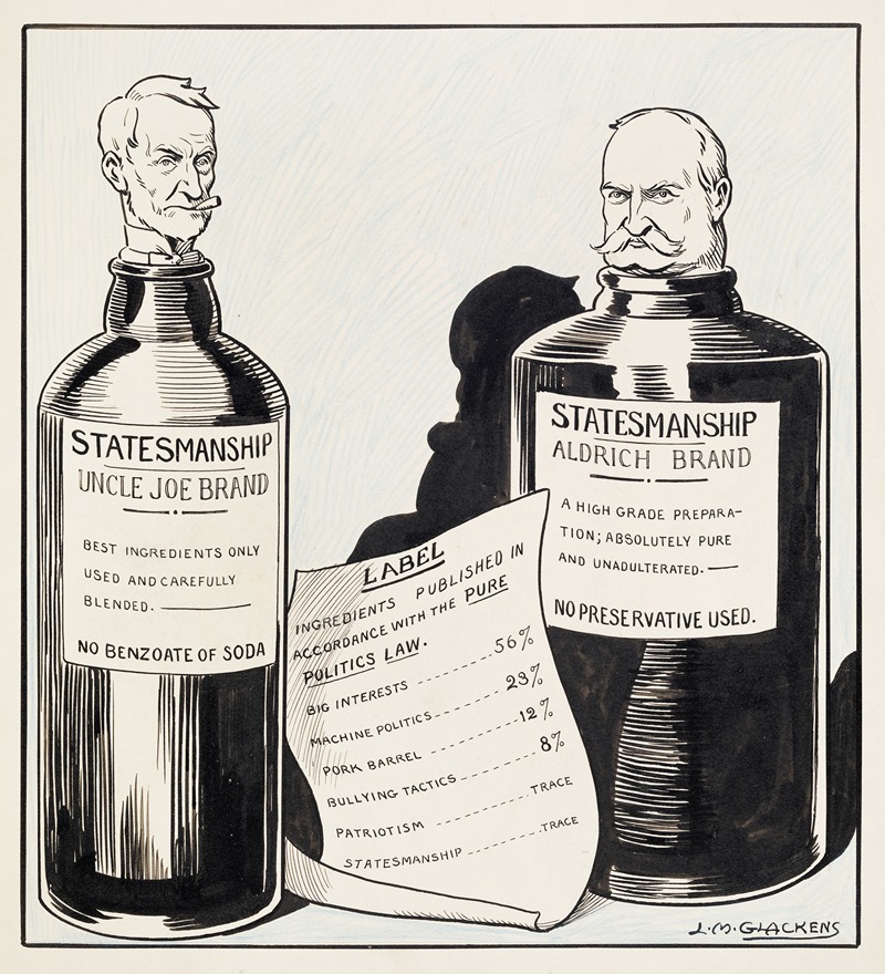 "Whiskey doesn’t need new labels half as much as these bottles do, Mr. President" is a political cartoon created by American illustrator Louis M. Glackens. Louis Glackens, born in 1866 and died in 1933, was a notable cartoonist and illustrator known for his work in various magazines and publications during the late 19th and early 20th centuries. He was the brother of the famous painter William Glackens, a member of the Ashcan School.