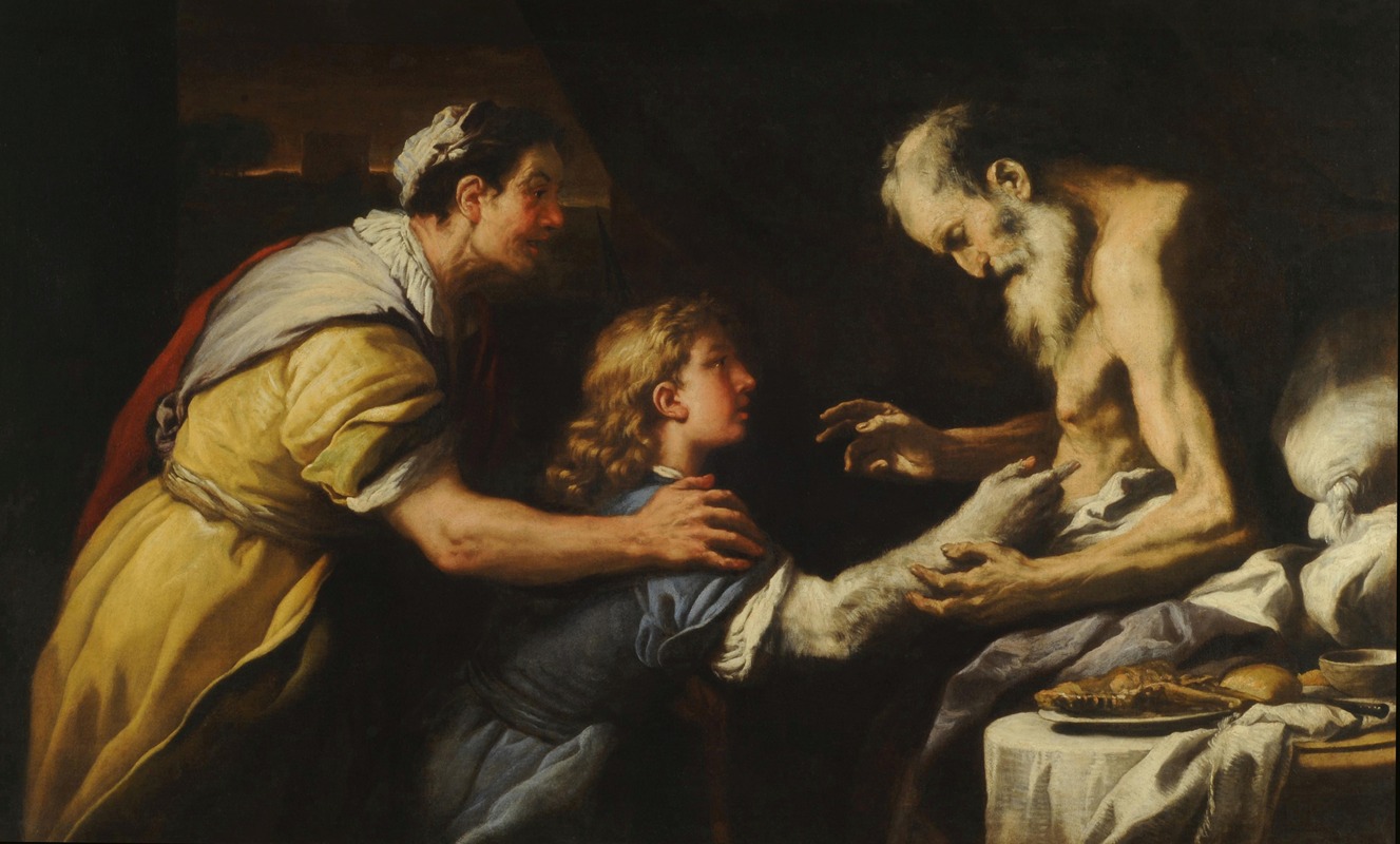 In Giordano's depiction, the composition is dynamic and filled with emotional intensity. Isaac, portrayed as an elderly and frail figure, is seated, reaching out to touch Jacob, who is disguised as Esau. Jacob is shown with animal skins on his arms to mimic Esau's hairy appearance, a crucial part of the deception. Rebekah, often included in such scenes, is typically depicted nearby, orchestrating the deceit with a mix of anxiety and determination.