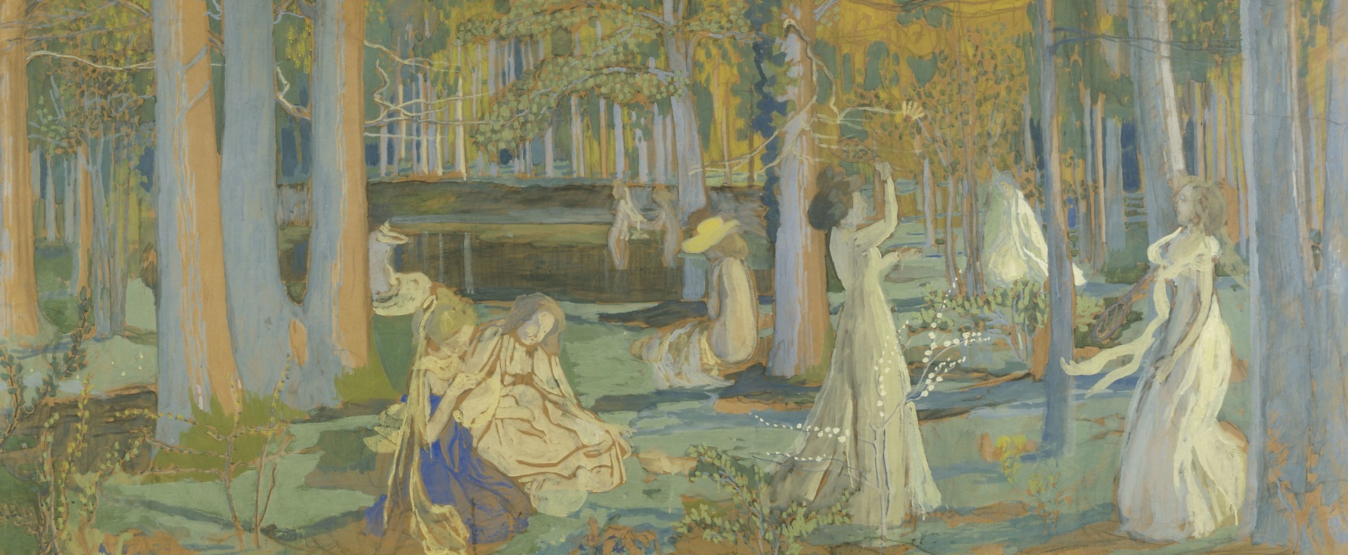 Denis's work often explored themes of spirituality and the divine, and he was deeply influenced by his Catholic faith. This influence is reflected in his frequent use of religious symbolism and his interest in depicting scenes that evoke a sense of the sacred. The "sacred wood" in the title may allude to a place of spiritual significance, a common motif in Denis's oeuvre, where nature often serves as a setting for divine or mystical experiences.