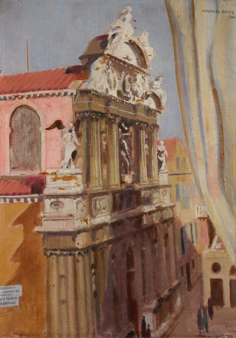Maurice Denis, a prominent French painter and theoretician associated with the Symbolist and later the Nabi movement, created the artwork Santa Maria Zobenigo, Venise. This painting depicts the Church of Santa Maria del Giglio (commonly referred to as Santa Maria Zobenigo), a Baroque-style church located in Venice, Italy. The church is renowned for its ornate façade, which features intricate sculptures and reliefs dedicated to the Barbaro family, who financed its construction in the late 17th century.