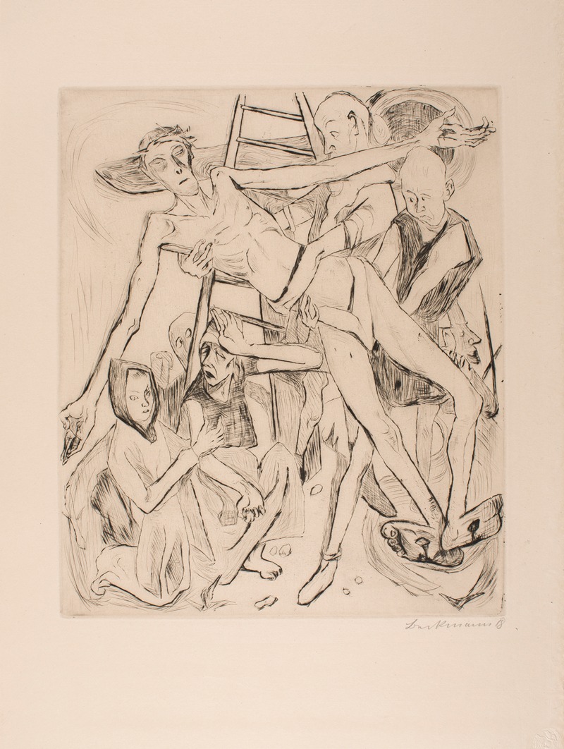 Max Beckmann, a prominent German painter and printmaker, is known for his contributions to the art world during the early 20th century. One of his notable works is "Descent from the Cross," which is plate 11 from the portfolio titled "Faces." This piece is a part of Beckmann's exploration of religious themes, a subject he revisited throughout his career, often infusing it with his unique expressionist style.