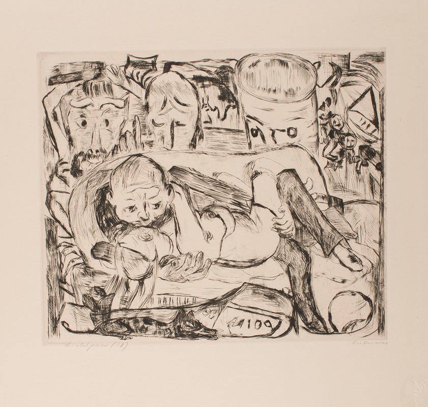 Max Beckmann's "Lovers II, plate 5 from the portfolio ‘Faces’" is a work of art created by the renowned German painter, printmaker, and draftsman Max Beckmann (1884–1950). This piece is part of the portfolio titled "Faces" ("Gesichter" in German), which was published in 1919. The portfolio consists of a series of lithographs that reflect Beckmann's distinctive style and his exploration of human emotions, relationships, and societal themes during the early 20th century.