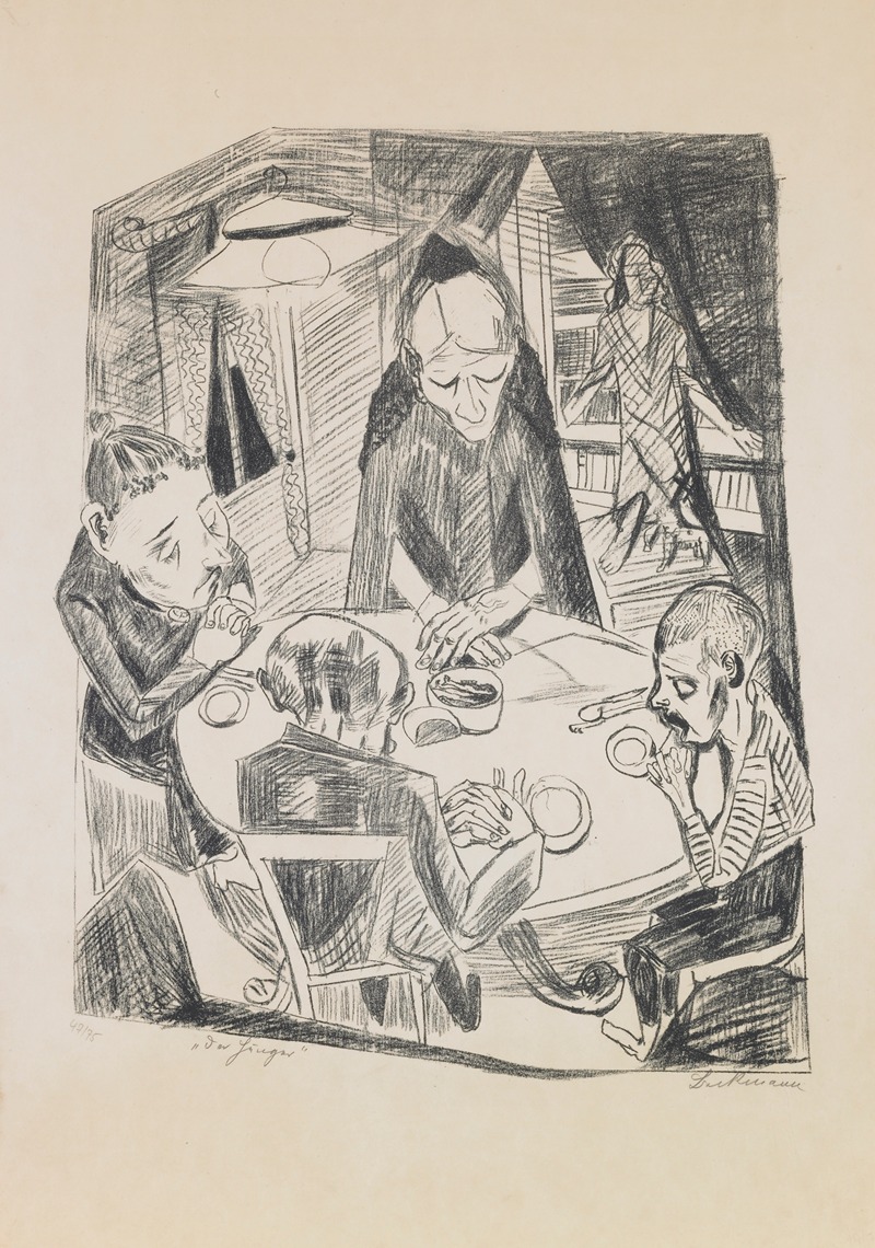 Plate 5: Hunger depicts a stark and harrowing scene of deprivation and suffering, characteristic of the widespread hunger and poverty that plagued Germany during the post-war period. The etching portrays emaciated figures in a confined, oppressive space, emphasizing the physical and emotional toll of starvation. Beckmann's use of sharp, angular lines and dense cross-hatching creates a sense of claustrophobia and despair, underscoring the harsh realities faced by many in the aftermath of the war.