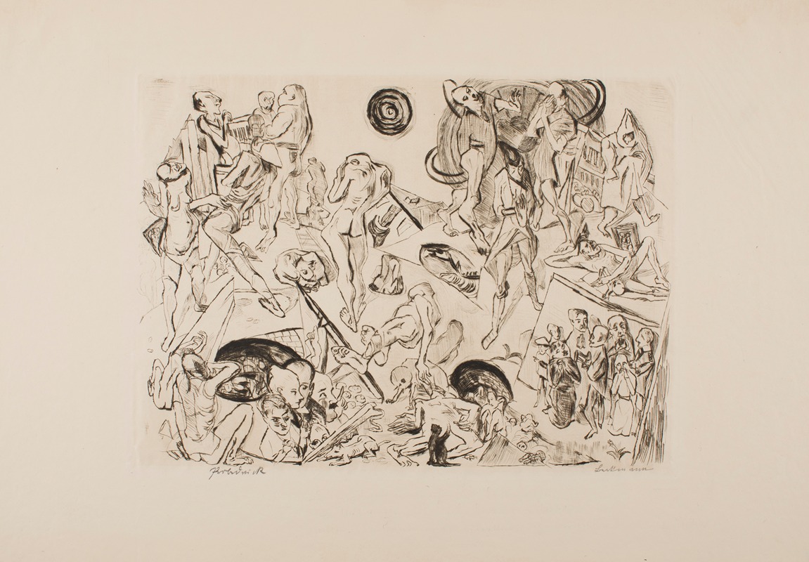 Max Beckmann was a prominent German painter, draftsman, printmaker, and writer, known for his unique style that combined elements of Expressionism, New Objectivity, and a personal form of modernism. One of his notable works is "Resurrection," plate 12 from the portfolio titled "Faces." This portfolio is a significant part of Beckmann's oeuvre, showcasing his skill in printmaking and his ability to convey complex themes through this medium.