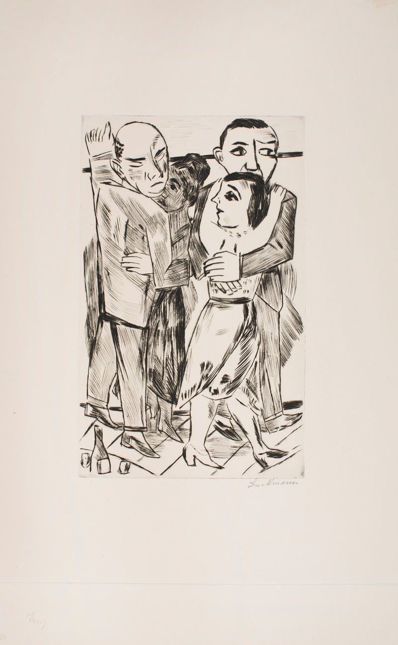 The painting depicts two pairs of dancers, rendered in Beckmann's characteristic angular and dynamic style. The figures are shown in a lively and somewhat theatrical scene, with a sense of movement and energy that captures the essence of dance. The composition is tightly packed, with the figures overlapping and interacting in a way that creates a sense of intimacy and tension. Beckmann's use of strong lines and contrasting colors adds to the dramatic effect of the piece.