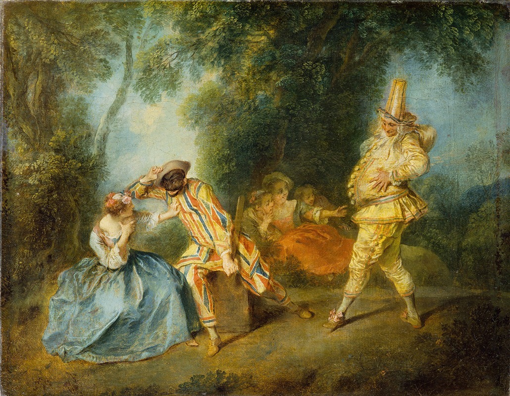 This particular painting, An Italian Comedy Scene, is believed to depict a moment inspired by the commedia dell'arte, a form of Italian improvisational theater that was highly popular in Europe during the 17th and 18th centuries. The commedia dell'arte featured stock characters such as Harlequin, Pierrot, and Columbine, who often appeared in humorous and romantic scenarios. Lancret's work captures the theatricality and playful spirit of this tradition, with figures dressed in elaborate costumes and engaging in a lively performance.
