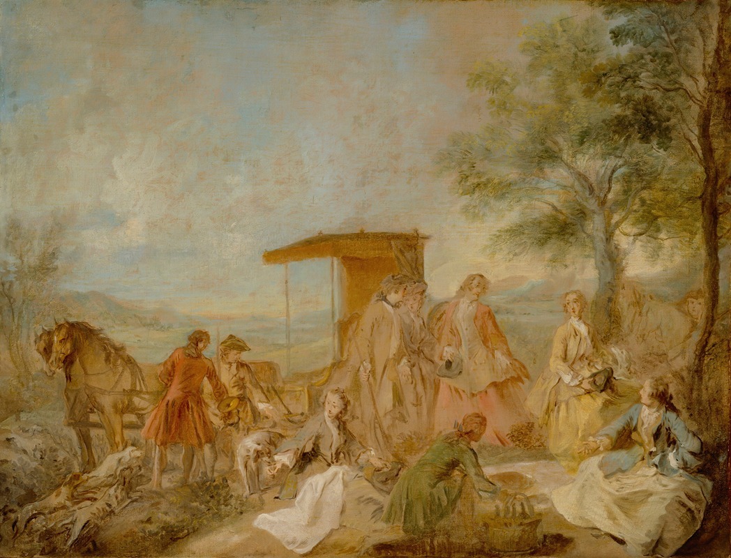 "The Repast of the Hunting Party" is a painting that captures a moment of leisure and festivity among a group of elegantly dressed men and women. The scene is set in a lush, verdant landscape, typical of the Rococo style, which often emphasized nature as a backdrop for human activities. The painting depicts a group of individuals who have paused during a hunting expedition to enjoy a meal. This theme of outdoor leisure was popular in Rococo art, reflecting the era's fascination with nature and the pleasures of the countryside.