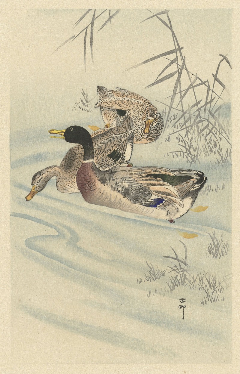 Ohara Koson (1877–1945) was a prominent Japanese artist known for his exquisite woodblock prints, particularly those depicting birds and flowers, a genre known as kachō-ga. His work is celebrated for its delicate beauty, attention to detail, and the ability to capture the essence of nature. One of his notable works is "Three Ducks in Shallow Water with Reed," which exemplifies his mastery in portraying avian subjects in their natural habitats.
