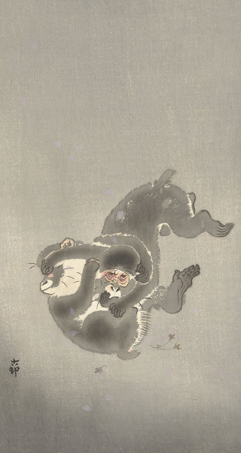 "Two Monkeys Playing" is one of Koson's notable works, showcasing his skill in capturing the delicate balance between realism and stylization that characterizes much of his oeuvre. This particular piece features two monkeys, a subject that, while less common than his bird and flower prints, demonstrates Koson's versatility and keen observation of nature. The monkeys are depicted in a playful interaction, a scene that conveys a sense of movement and liveliness.