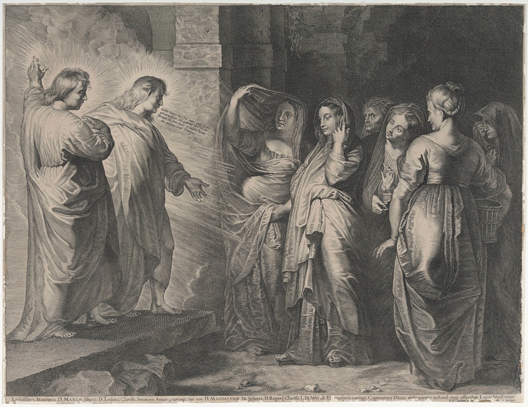 Rubens, known for his dynamic compositions and masterful use of color and light, portrays the scene with dramatic intensity and emotional depth. The painting features two angels, dressed in luminous white robes, gesturing toward the empty tomb. Their expressions and gestures convey the divine message of resurrection. Opposite them, the holy women—traditionally identified as Mary Magdalene, Mary the mother of James, and Salome—are shown in a state of awe and reverence. Their postures and facial expressions reflect a mixture of astonishment, fear, and hope.