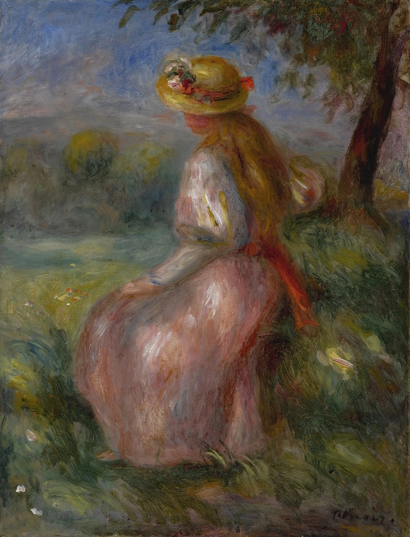 The composition of "Jeune fille en rose" is intimate, with the girl occupying a significant portion of the canvas. Her expression is serene and contemplative, inviting the viewer to ponder her thoughts and emotions. Renoir's attention to detail is evident in the delicate rendering of the girl's features and the careful depiction of the play of light across her face and clothing.