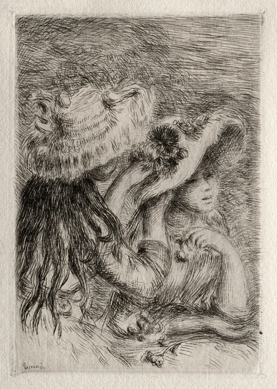 The painting exists in two versions, both created in the late 1890s. The subject of the artwork is two young girls, one of whom is pinning a hat onto the other. The composition highlights Renoir's ability to depict intimate, everyday moments with warmth and sensitivity. The figures are rendered with soft, delicate brushstrokes, characteristic of Renoir's later style, which often emphasized a more refined and polished approach compared to his earlier, more spontaneous Impressionist works.